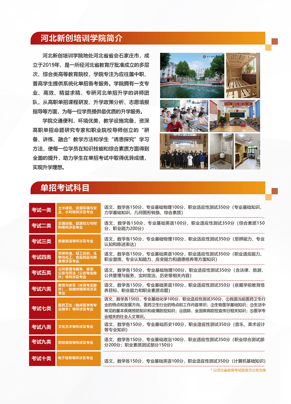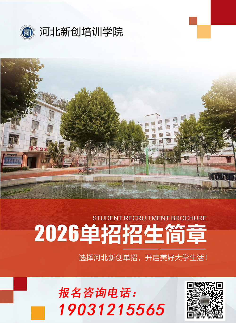 河北新创培训学院地处河北省省会石家庄市,成立于2019年,是一所经河北省教育厅批准成立的多层次、综合类高等教育院校,学院专注为应往届中职、普高学生提供系统化单招备考服务。学院拥有一支专业、高效、精益求精、专研河北单招升学的讲师团队,从高职单招课程研发、升学政策分析、志愿填报指导等方面,为每一位学员提供最优质的升学服务。